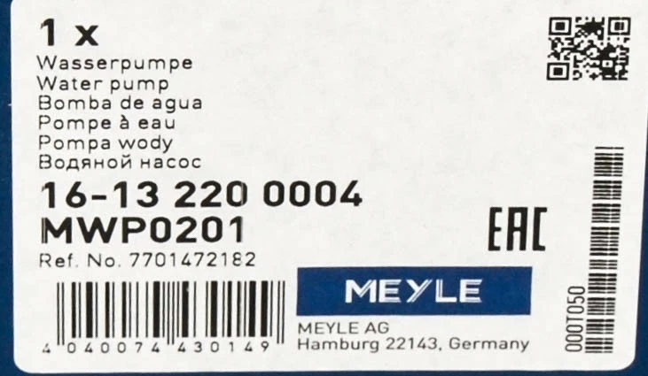 Водяной насос 1.9dCi — Meyle (Германия) Код 16-13 220 0004