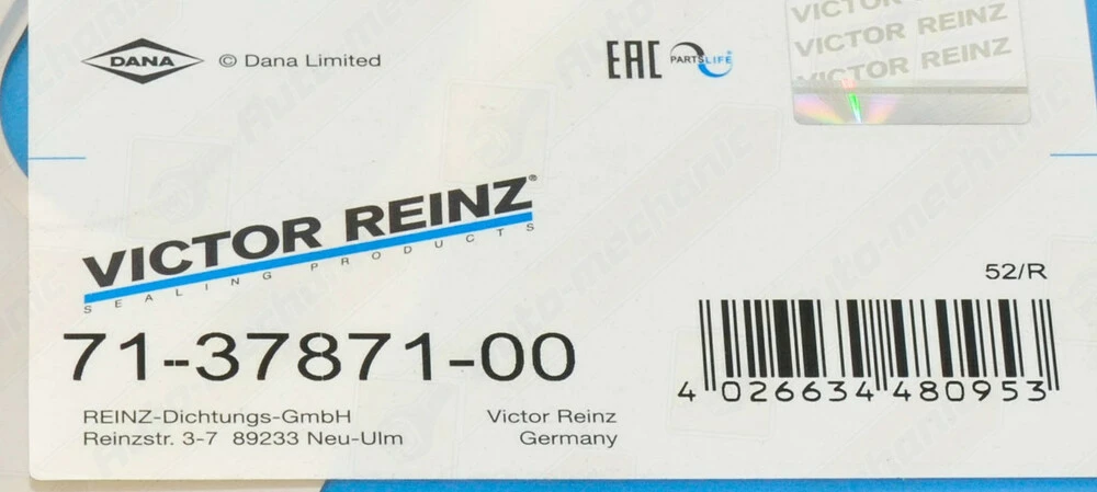 «VICTOR REINZ» — это высококачественные автомобильные уплотнения: прокладки головки блока; прокладки крышек, поддонов; сальники; маслосъемные колпачки; комплекты прокладок; а также болты головки блока. Изделия VICTOR REINZ поставляются в автомобильное производство BMW, Ford, Mercedes и поступает на рынок запчастей.